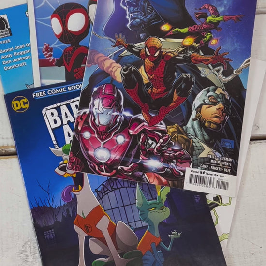 These are pre-selected bundles of safe, non-allergenic comics, filled with action, humor, and adventure that kids will love. No choices, no swaps—just the comics we have on hand, all guaranteed family-friendly.