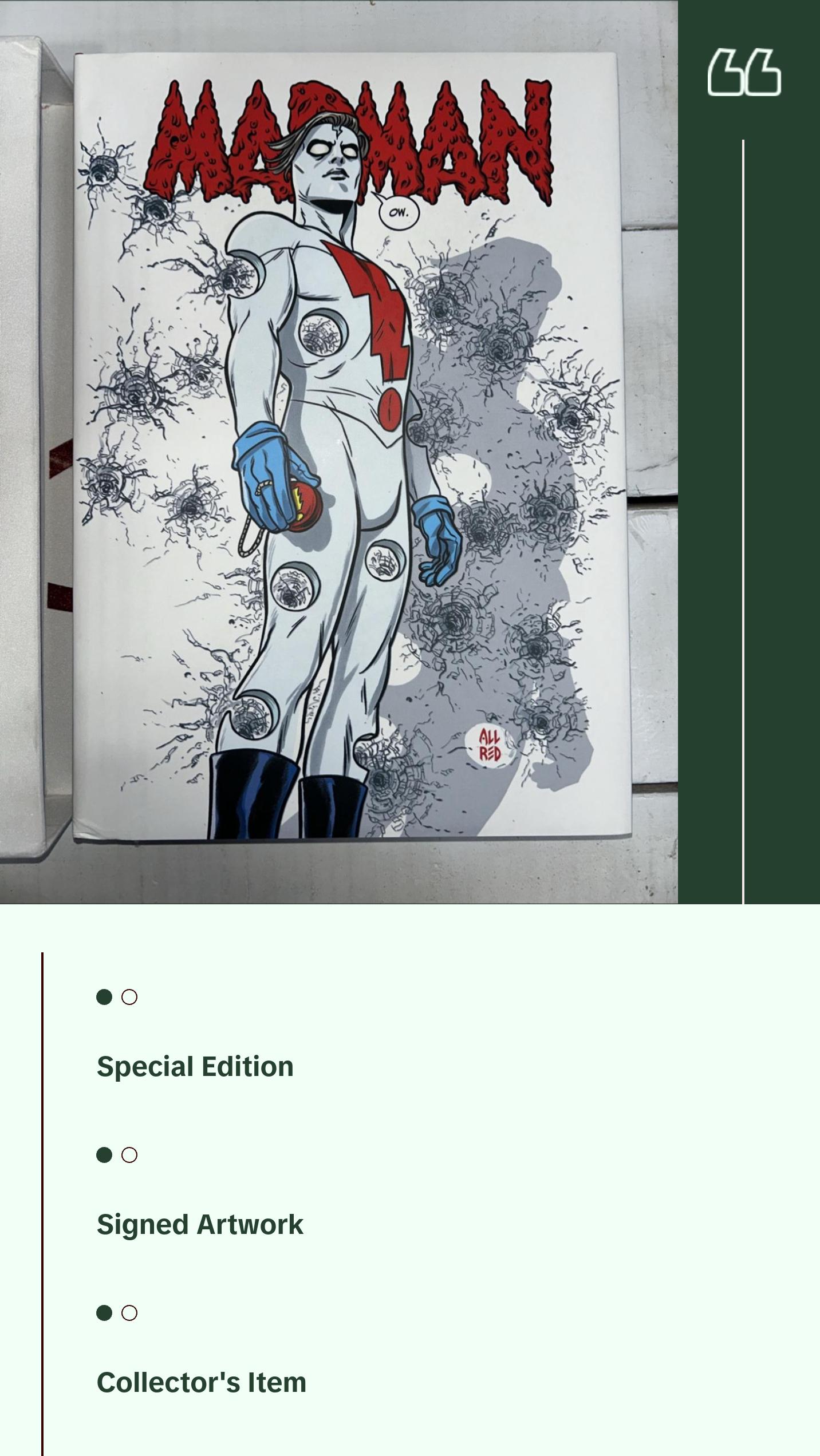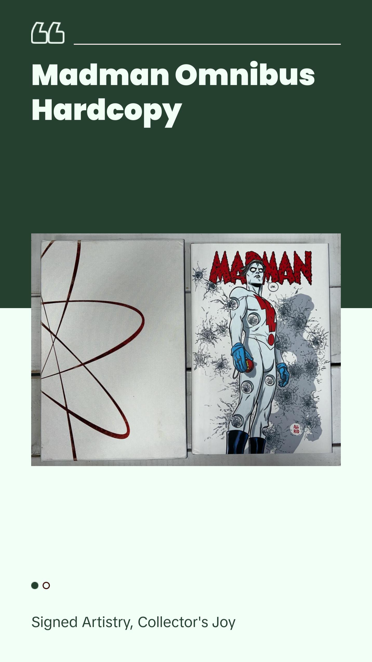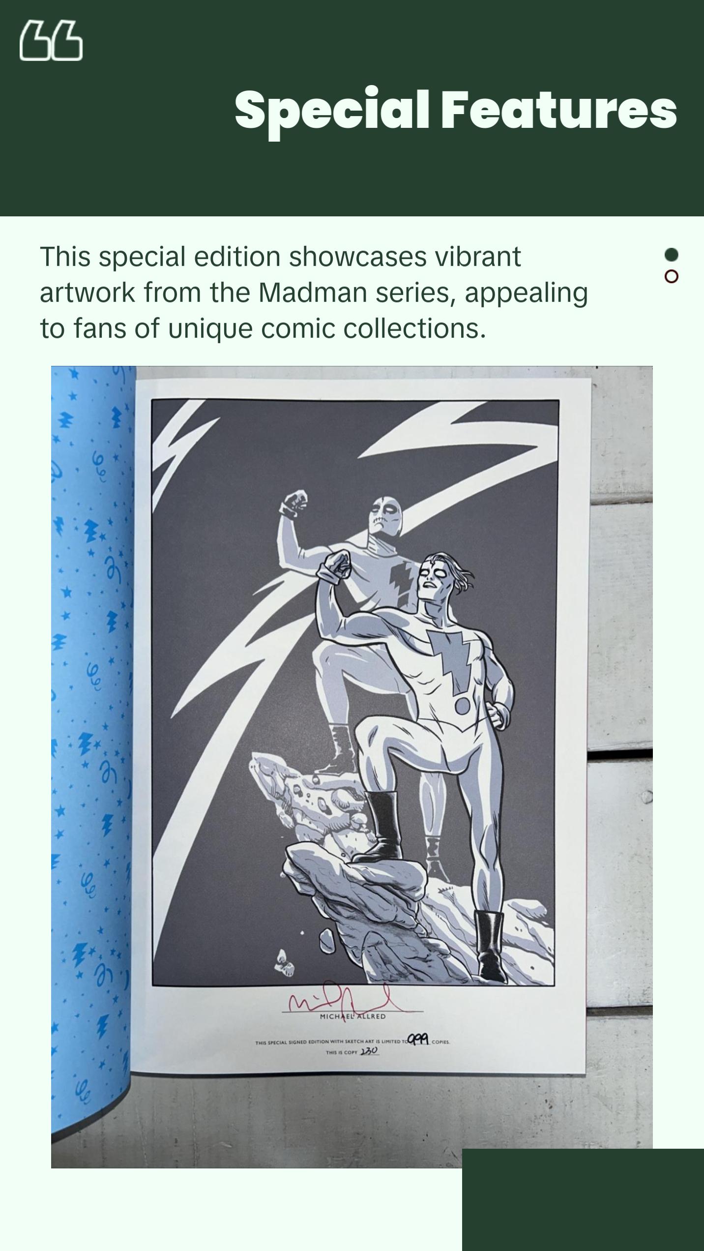 - Special Edition Comic BookThis unique comic book collection honors the Madman series. It features Mike Allred's colorful artwork, signed by him. The book includes stories from the Madman series, published by IDW. It's a hardcover edition, perfect for collectors.